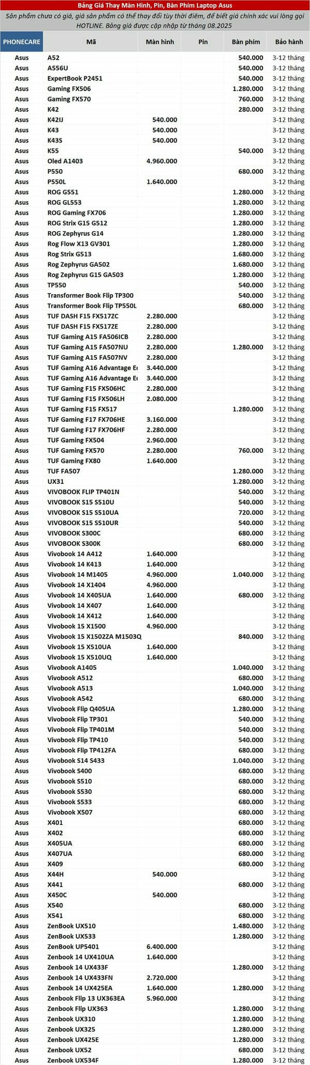 Bảng Giá Thay Màn Hình, Pin, Bàn Phím Asus